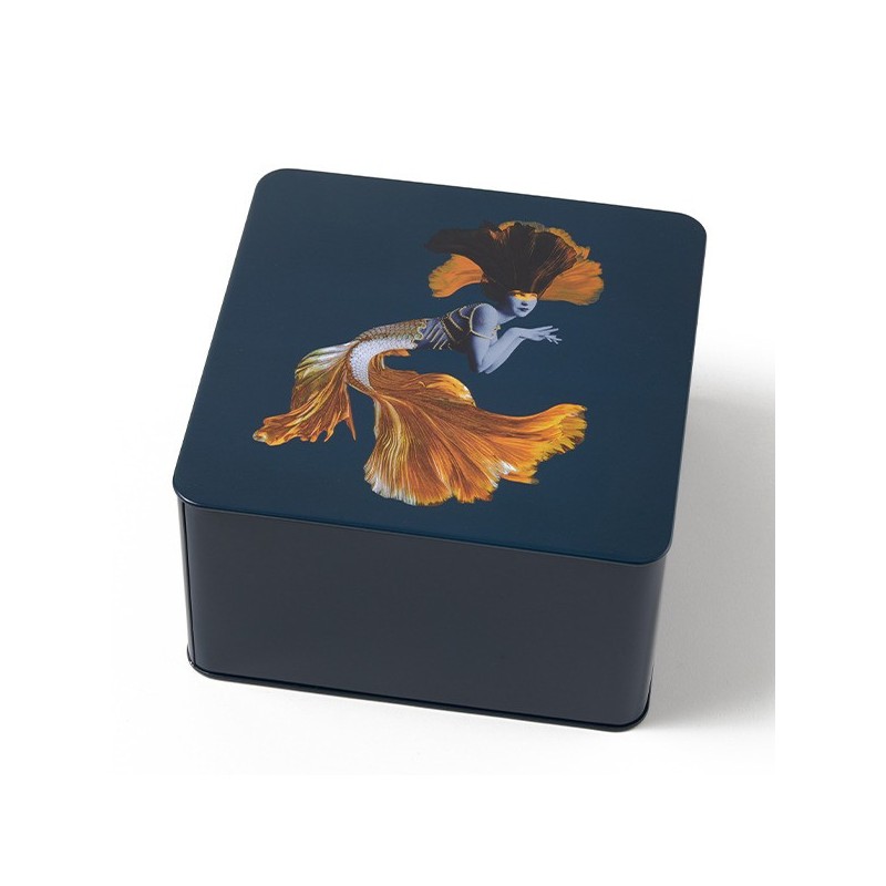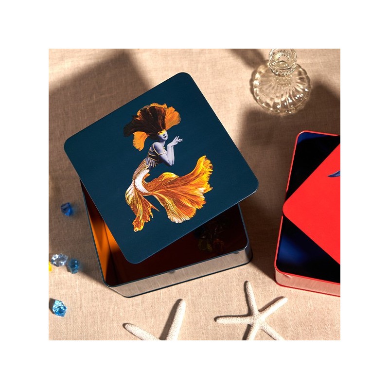 Scatola di latta quadrata blu con coperchio decorato da una stampa mosaico. Vivido e dal design accattivante, questo pezzo è perfetto per portare colore e allegria nella tua casa. Leggero e resistente, è facile da pulire ed è ideale come contenitore multiuso. Provalo come contenitore decorativo per ogni angolo della tua casa, dal salotto alla cucina! Ideale come scatola per gioielli, trucchi e piccoli oggetti, come box per le caramelle o come scatola svuota tasche per doggiorno, camera da letto o studio. Il prodotto è realizzato a mano ed è consigliabile lavarlo a mano o con un panno umido. Scopri gli altri contenitori ed accessori per la casa della stessa linea!